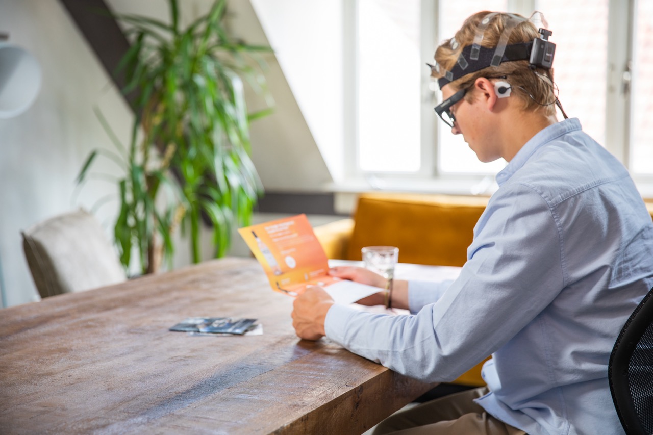 We doen 'neuromarketing onderzoek'. Dat betekent dat we in ons huiskamerlab in Utrecht onderzoek doen naar hoe jouw brein op reclames en websites reageert. Dit doen we met een comfortabele EEG headset. Deze headset zetten we op je hoofd, als een soort muts. Eerdere participanten geven aan dat het prettig zit en dat je er eigenlijk niks van merkt.